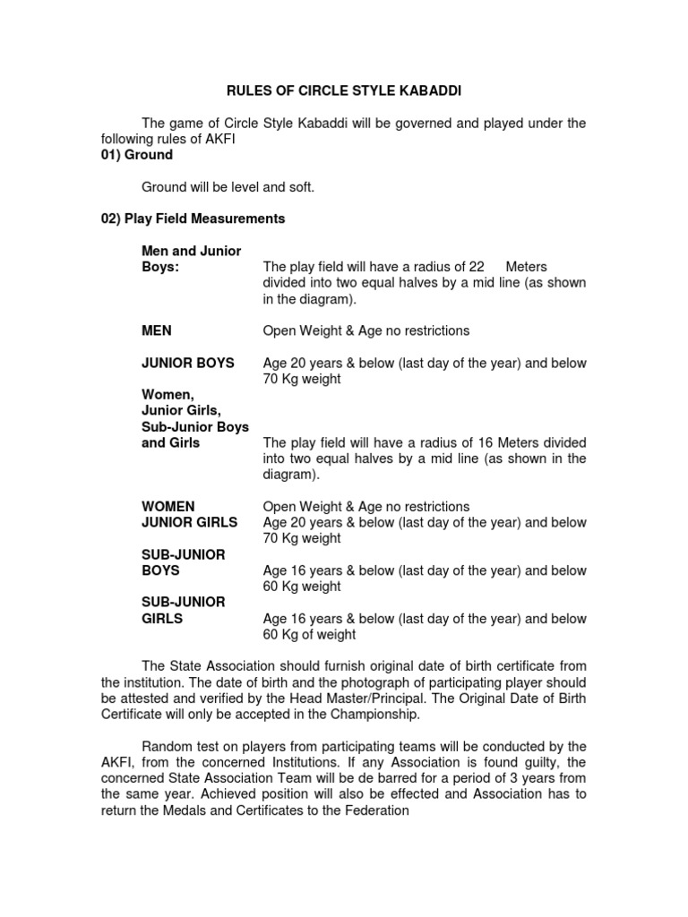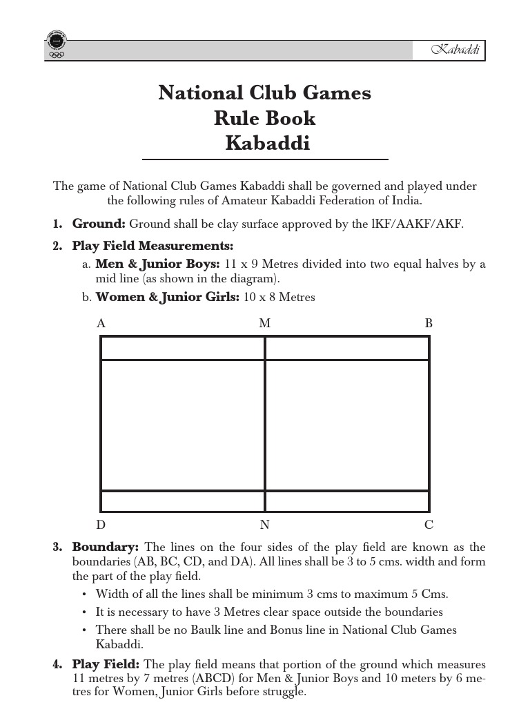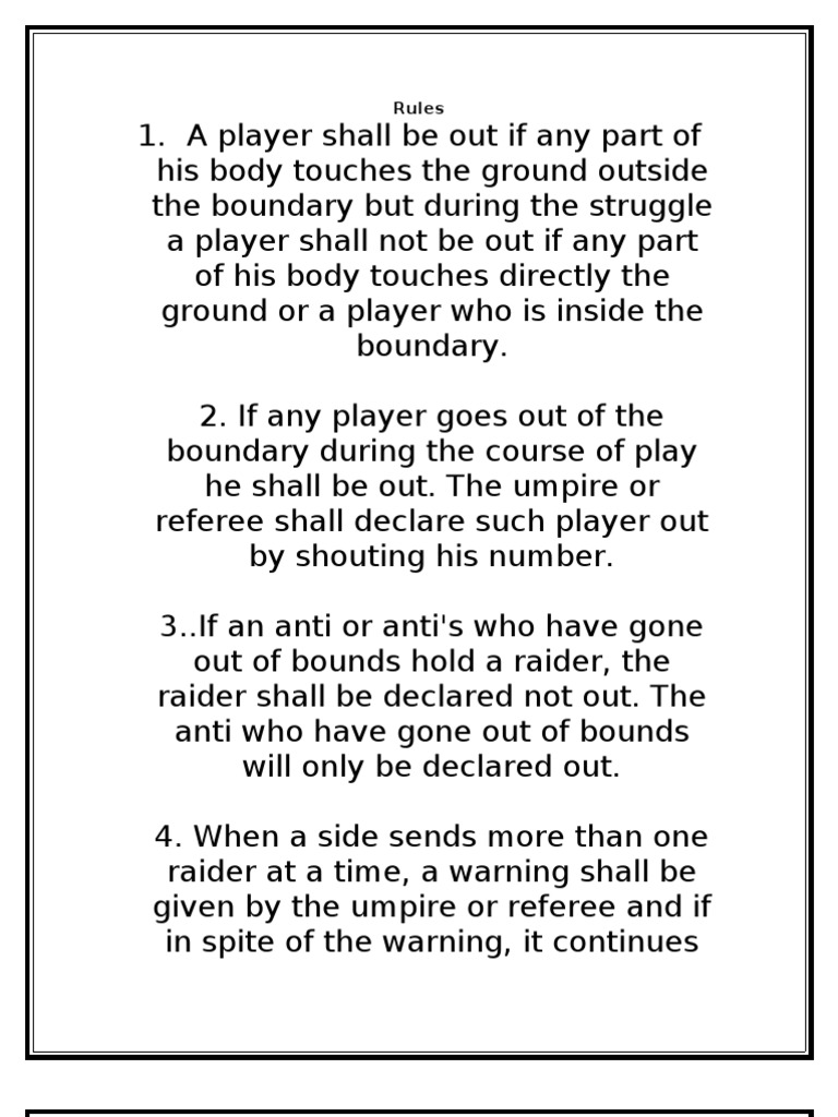 A player shall be out if any part of his body touches the ground outside the boundary but during the struggle a player shall not be out if any part of his body touches directly the ground or a player who is inside the boundary. Rules & regulations download rules & regulations. It must consist of half s.